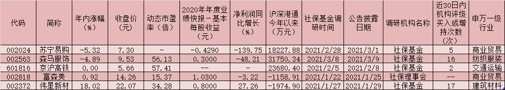表:年內(nèi)獲社?;鹫{(diào)研的個股一覽