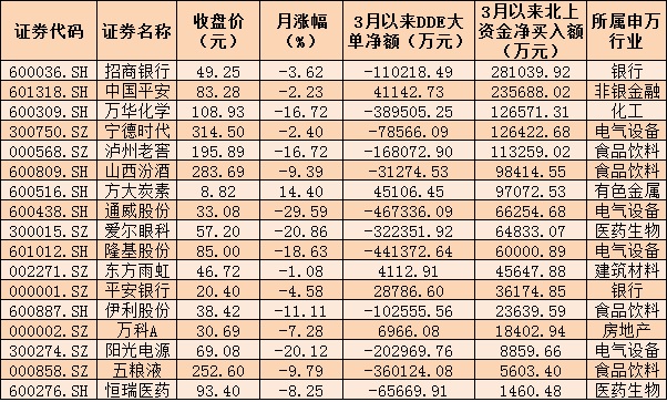 從滬股通、深股通前十大成交活躍股來(lái)看,3月以來(lái),共有32只個(gè)股現(xiàn)身前十大成交活躍股榜單,17只活躍股處于期間凈買入狀態(tài),北上資金合計(jì)凈買入140.93億元。其中,招商銀行、中國(guó)平安、萬(wàn)華化學(xué)、寧德時(shí)代、瀘州老窖等5只個(gè)股,期間北上資金凈買入額居前均超10億元,分別為28.1億元、23.57億元、12.66億元、12.64億元和11.33億元。