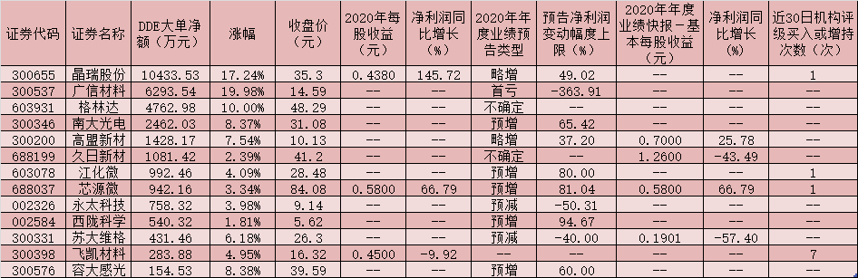 同時(shí),截至目前,還有12家公司也披露了2020年年度業(yè)績預(yù)告,8家公司業(yè)績預(yù)喜。光華科技預(yù)計(jì)2020年全年凈利潤同比增長233.20%;西隴科學(xué)、江化微、南大光電、雅克科技、容大感光等5家公司均預(yù)計(jì)2020年全年凈利潤同比增長50%以上。