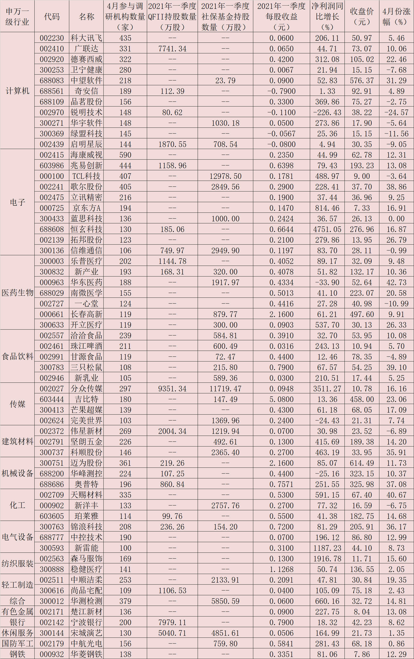 表:4月份受到100家以上機(jī)構(gòu)密集調(diào)研的個(gè)股一覽
