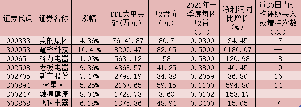 表:5月20日受到千萬(wàn)元以上大單資金追捧的家用電器股