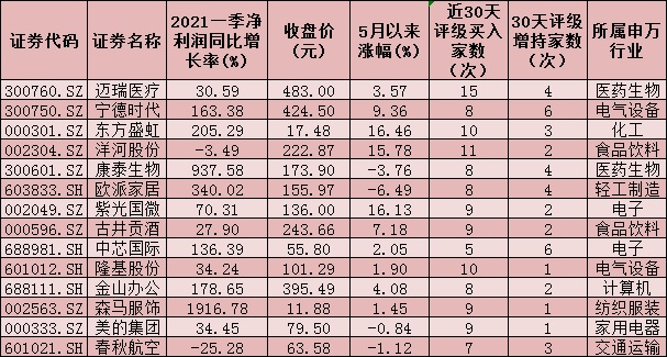 《證券日?qǐng)?bào)》記者根據(jù)同花順統(tǒng)計(jì)發(fā)現(xiàn),近30日內(nèi),包括中金公司、申銀萬(wàn)國(guó)、銀河證券、國(guó)泰君安、中信證券、招商證券等主流券商在內(nèi)的53家券商共推薦了1010只個(gè)股,其中,受到5次以上券商“相中”(含買(mǎi)入和增持評(píng)級(jí))的個(gè)股有112只。值得關(guān)注的是,邁瑞醫(yī)療、寧德時(shí)代、東方盛虹、洋河股份、歐派家居、康泰生物、中芯國(guó)際、古井貢酒、紫光國(guó)微、隆基股份、春秋航空、金山辦公、美的集團(tuán)、森馬服飾等14只個(gè)股,期間均獲得10次及以上,機(jī)構(gòu)給予“買(mǎi)入”或“增持”等看好評(píng)級(jí)。