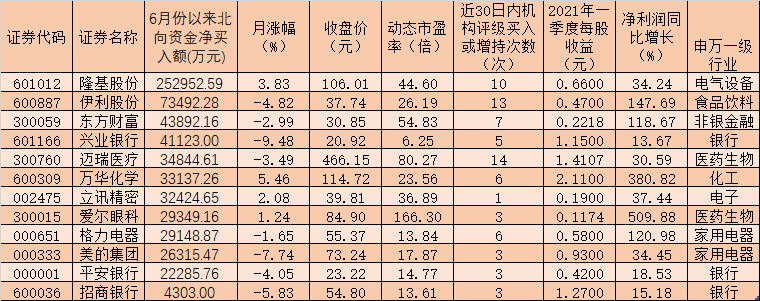 可以看到,近期外資持續(xù)流入A股,富時(shí)中國A50指數(shù)成份股成為外資搶籌的重點(diǎn)目標(biāo)。統(tǒng)計(jì)顯示,上述50只成份股中,6月份以來截至6月15日,有28只個(gè)股現(xiàn)身滬股通、深股通的前十大成交活躍股榜單,有12只成份股月內(nèi)處于北向資金凈買入狀態(tài),合計(jì)吸金62.33億元。其中,隆基股份期間累計(jì)北向資金凈買入額居首,達(dá)到25.30億元,伊利股份、東方財(cái)富、興業(yè)銀行、邁瑞醫(yī)療、萬華化學(xué)、立訊精密等6只個(gè)股期間也均受到3億元以上北向資金青睞,后市表現(xiàn)值得關(guān)注。