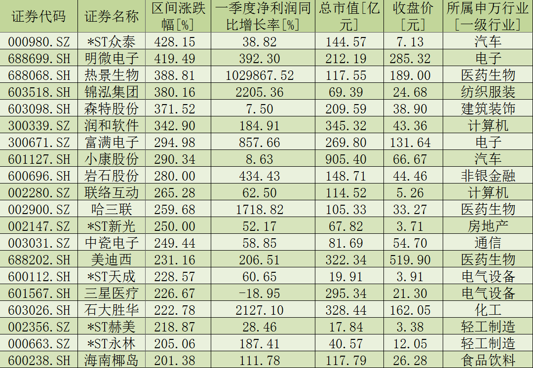 表:截至6月30日,2021年上半年在全部A股中股價(jià)漲幅超200%個(gè)股一覽