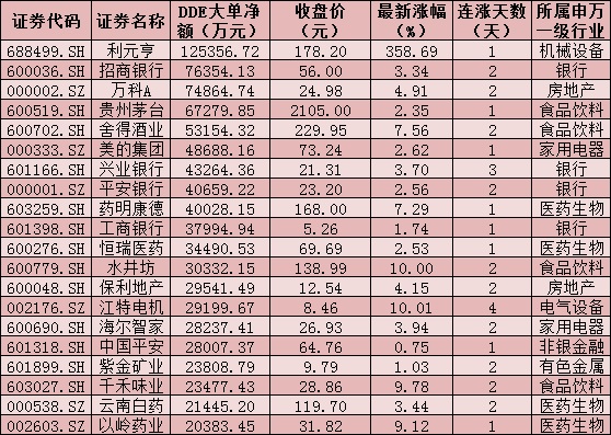 一、周四(7月1日)DDE大單資金凈買入TOP20