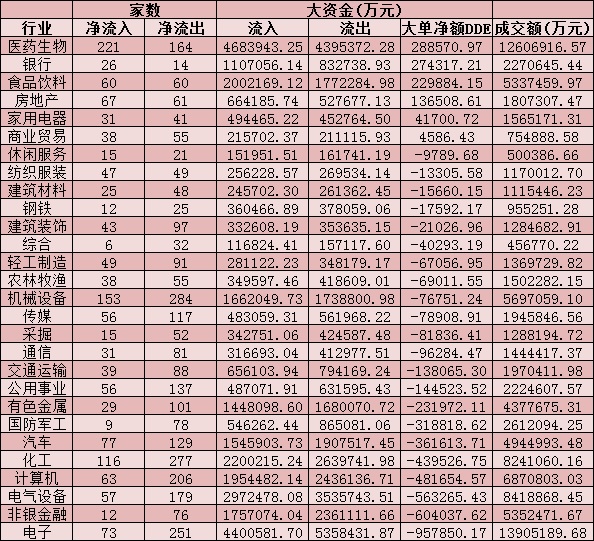 從資金層面看,周四,A股大單資金整體凈流出385.3億元,其中,有1453只個(gè)股呈現(xiàn)資金凈流入,有2851只個(gè)股呈現(xiàn)資金凈流出。從申萬(wàn)一級(jí)的28個(gè)行業(yè)來(lái)看,有6個(gè)行業(yè)現(xiàn)資金凈流入態(tài)勢(shì),其中,醫(yī)藥生物、銀行、食品飲料、房地產(chǎn)等4個(gè)行業(yè)呈現(xiàn)資金凈流入均超10億元,分別為28.86億元、27.43億元、22.99億元和13.65億元,合計(jì)達(dá)92.93億元。另外,22個(gè)行業(yè)均呈現(xiàn)資金凈流出態(tài)勢(shì),其中,電子、非銀金融、電氣設(shè)備、計(jì)算機(jī)、化工等行業(yè),資金凈流出均超40億元。