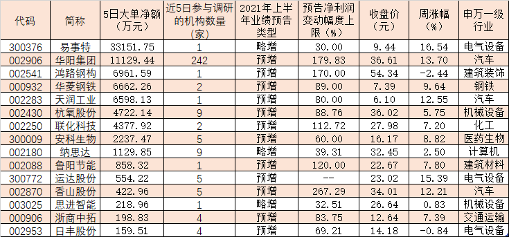 表:本周獲大單資金追捧且上半年業(yè)績預(yù)喜的機(jī)構(gòu)調(diào)研個股