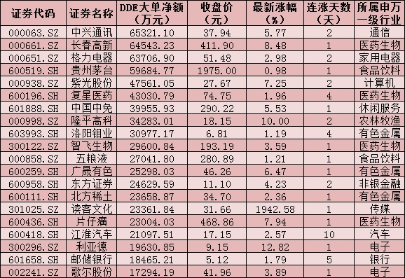 一、周一(7月19日)DDE大單資金凈買入TOP20