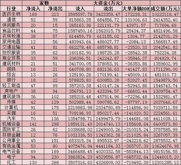 從資金層面看,周一,A股大單資金整體凈流出369.5億元,其中,有1411只個(gè)股呈現(xiàn)資金凈流入,有2901只個(gè)股呈現(xiàn)資金凈流出。從申萬(wàn)一級(jí)的28個(gè)行業(yè)來(lái)看,僅有5個(gè)行業(yè)呈現(xiàn)資金凈流入態(tài)勢(shì)。其中,醫(yī)藥生物和通信等2個(gè)行業(yè)資金凈流入均超10億元,分別為17.22億元和13.1億元。另外,23個(gè)行業(yè)均呈現(xiàn)資金凈流出態(tài)勢(shì),其中,化工、電子、電氣設(shè)備、有色金屬等四行業(yè),資金凈流出均超30億元。