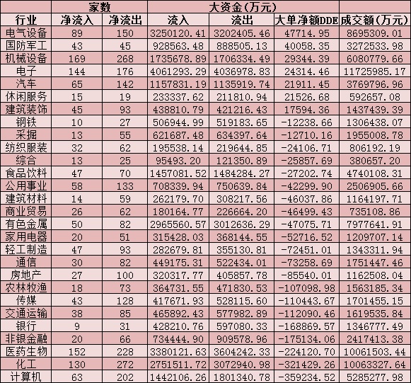 從資金層面看,A股大單資金整體凈流出194.4億元,其中,有1421只個股呈現(xiàn)資金凈流入,有2863只個股呈現(xiàn)資金凈流出。從申萬一級的28個行業(yè)來看,僅有7個行業(yè)呈現(xiàn)資金凈流入態(tài)勢。其中,電氣設備和國防軍工等兩個行業(yè)資金凈流入均超4億元,分別為4.77億元和4.01億元。另外,21個行業(yè)呈現(xiàn)資金凈流出態(tài)勢,其中,計算機、化工、醫(yī)藥生物等三行業(yè),資金凈流出均超20億元。