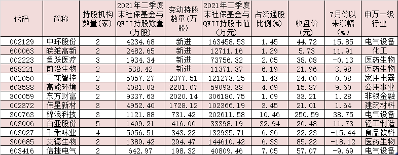 綜合來看,上述個股中,有13只個股今年二季度受到了社?;鹨约癚FII集體增持,增持資金達(dá)到64.65億元。具體來看,今年二季度社?;鹋cQFI聯(lián)手新進(jìn)持有中環(huán)股份、皖維高新、魚躍醫(yī)療、前沿生物等4只個股,持股數(shù)量分別為4234.68萬股、2482.65萬股、1934.34萬股、538.42萬股;有9只個股今年二季度受上述兩類機(jī)構(gòu)繼續(xù)加倉,三花智控、高能環(huán)境、東方財富、偉星新材等4只個股二季度社保基金與QFII增持?jǐn)?shù)量也均在1000萬股以上。