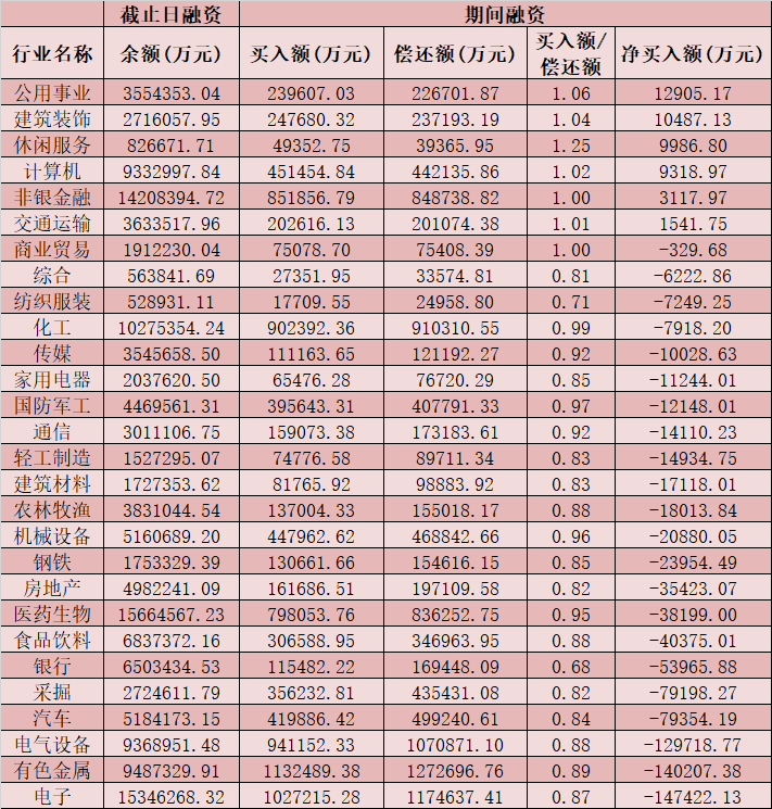 六、截至8月17日申萬一級行業(yè)兩融交易情況