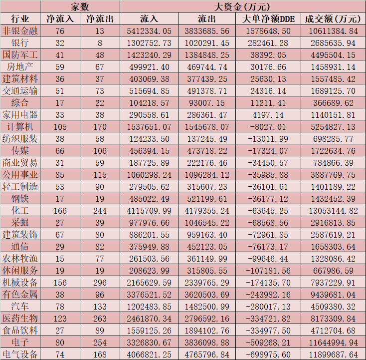 二、周三(8月18日)申萬一級行業(yè)大單資金流向