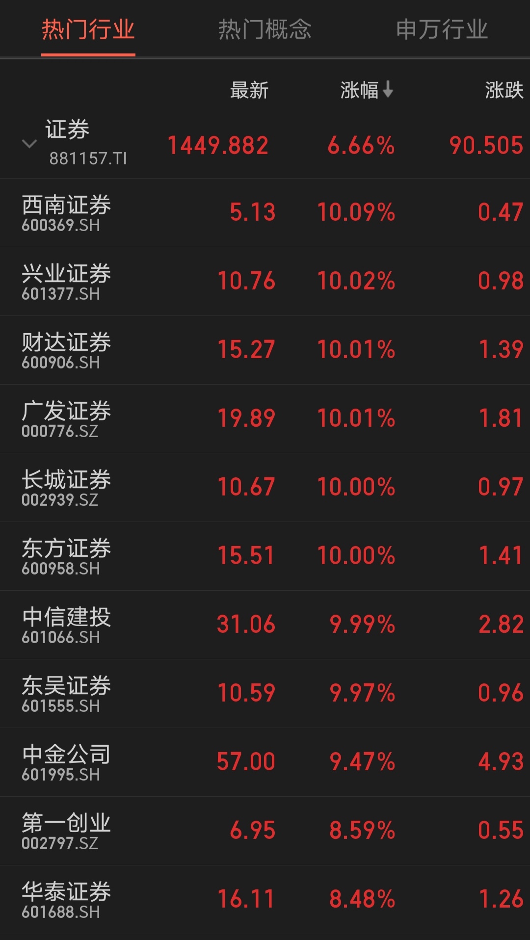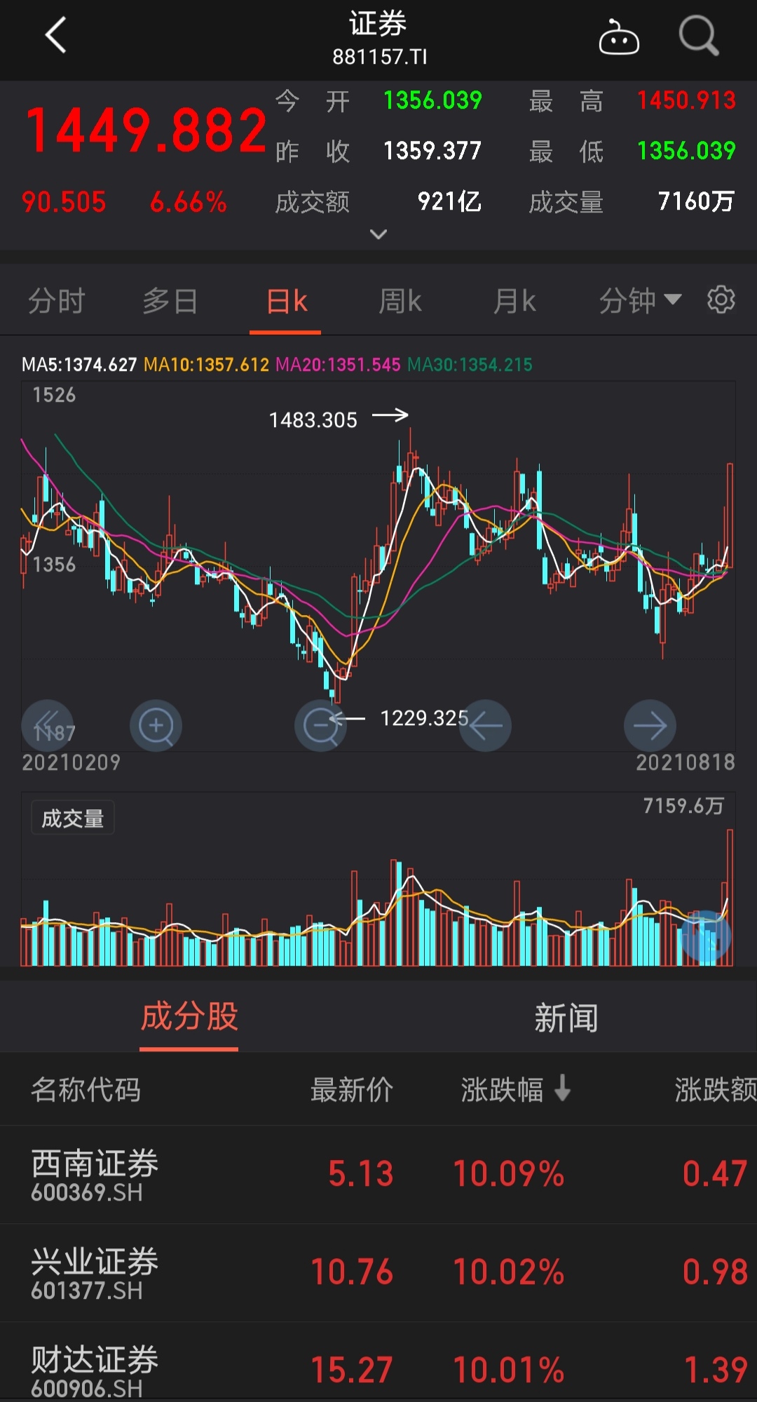 8月18日,同花順證券板塊指數(shù)上漲6.66%,跑贏上證指數(shù)(漲幅1.11%)。具體到個(gè)股方面,西南證券、興業(yè)證券、財(cái)達(dá)證券、廣發(fā)證券、東方證券、長(zhǎng)城證券、中信建投、東吳證券等8只個(gè)股聯(lián)袂漲停;此外,包括中金公司(9.47%)、第一創(chuàng)業(yè)(8.59%)、華泰證券(8.48%)等在內(nèi)的33只個(gè)股上漲幅度也均超過5%。