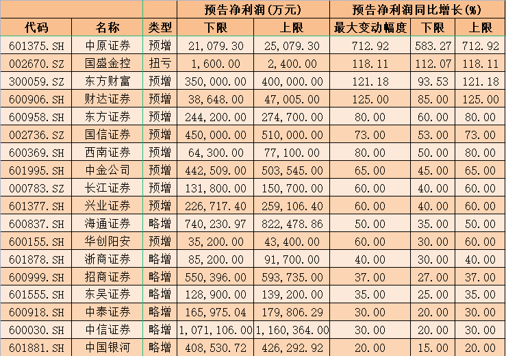 表:證券板塊18家業(yè)績(jī)預(yù)喜公司一覽