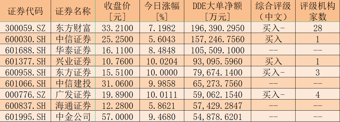表:8月18日,證券板塊獲大單資金凈買入額超5億元個(gè)股一覽