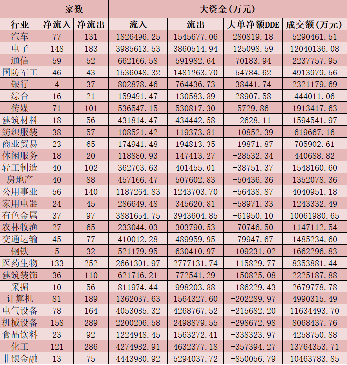 二、周四(8月19日)申萬(wàn)一級(jí)行業(yè)大單資金流向