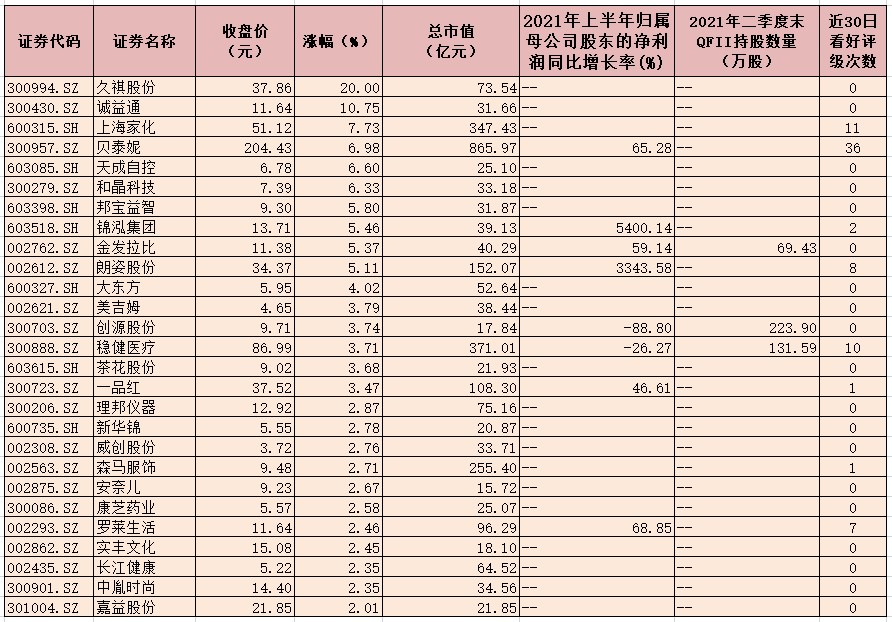 以QFII為代表的外資也看好三孩概念股。截至二季度末,在上述23只已經(jīng)發(fā)布半年報的個股中有6只個股的前十大流通股股東名單中有QFII現(xiàn)身,QFII合計持股數(shù)為1970.59萬股,其中,百亞股份獲QFII持股數(shù)最多,為1183.80萬股,創(chuàng)源股份、戴維醫(yī)療、愛嬰室、穩(wěn)健醫(yī)療、金發(fā)拉比等5只個股獲QFII持股數(shù)也均超69萬股。
