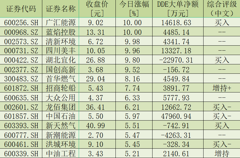 表:9月7日,天然氣板塊漲幅超5%個股一覽