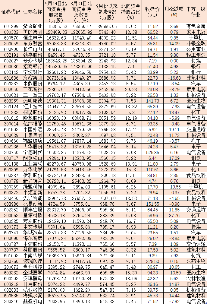 表:9月份以來(lái)北向資金增持?jǐn)?shù)量超1000萬(wàn)股且持股比例在5%以上的個(gè)股