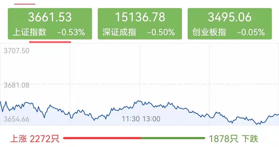 周二,A股三大指數(shù)集體收跌,截至收盤,上證指數(shù)跌0.53%,報(bào)3661.53點(diǎn),深證成指跌0.5%,報(bào)15136.78點(diǎn),創(chuàng)業(yè)板指微跌0.05%,報(bào)3495.06點(diǎn);滬深兩市合計(jì)成交額11411.17億元,兩市成交額連續(xù)第38個(gè)交易日突破1萬億元;北向資金凈買入60.26億元;總體來看,兩市個(gè)股漲多跌少。
