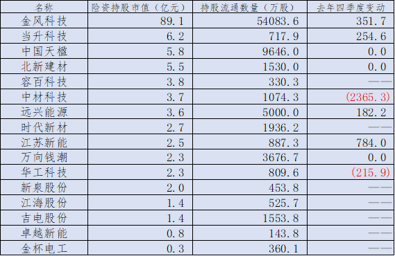 除上述兩大板塊之外,去年四季度險(xiǎn)資對(duì)新能源板塊加倉趨勢(shì)明顯。已披露的數(shù)據(jù)顯示,險(xiǎn)資去年四季度加倉了金風(fēng)科技、當(dāng)升科技、遠(yuǎn)興能源、江蘇新能等新能源股,截至去年四季度末持有金鳳科技的市值達(dá)89.1億元,暫列第一。