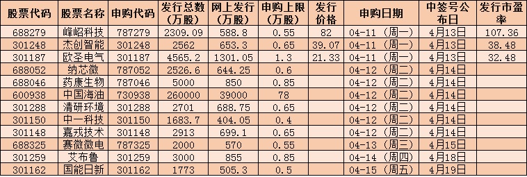 4月11日,冠龍節(jié)能將在創(chuàng)業(yè)板登陸。下周(4月11日-15日)將有12只新股發(fā)行,累計(jì)發(fā)行數(shù)量約33億股,預(yù)計(jì)募集資金75.92億元。其中,4月11日發(fā)行的是峰岹科技、杰創(chuàng)智能、歐圣電氣,4月12日發(fā)行的是納芯微、藥康生物、中國海油、清研環(huán)境、中一科技、嘉戎技術(shù),4月13日發(fā)行的是賽微微電,4月14日發(fā)行的是艾布魯,4月15日發(fā)行的是國能日新。
