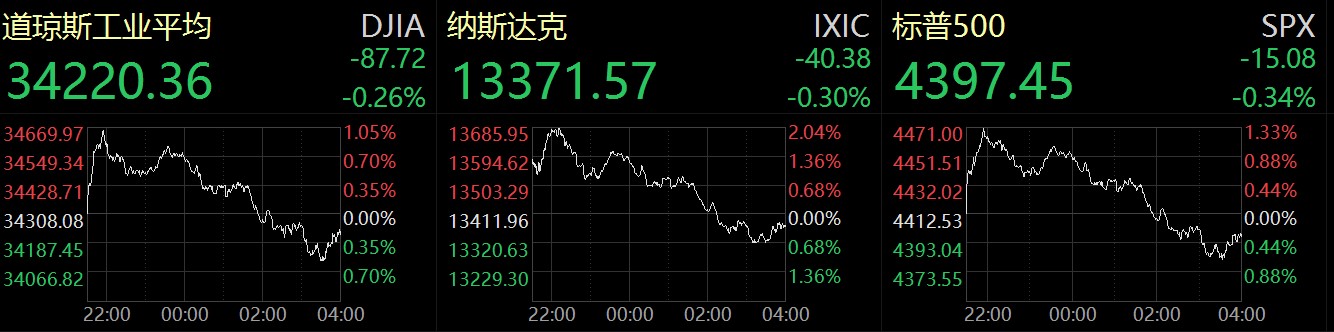 市場(chǎng)表現(xiàn)方面,當(dāng)?shù)貢r(shí)間4月12日,美股三大指數(shù)高開低走,道指和標(biāo)普500指數(shù)盤中一度漲逾1%,納指最高漲超2%,不過,三大指數(shù)集體收跌,截至收盤,道瓊斯指數(shù)跌0.26%,報(bào)34220.36點(diǎn);標(biāo)普500指數(shù)跌0.34%,報(bào)4397.45點(diǎn);納斯達(dá)克指數(shù)跌0.3%,報(bào)13371.57點(diǎn)。