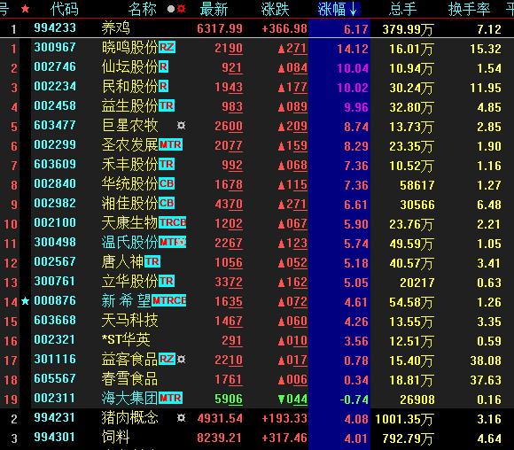 周一,農(nóng)業(yè)股表現(xiàn)出色,養(yǎng)雞、豬肉概念和飼料等三大農(nóng)業(yè)細(xì)分板塊漲幅居前均超4%,分別達(dá)6.17%、4.08%和4.01%。具體看,截至收盤(pán),金河生物、福成股份、仙壇股份、民和股份、粵海飼料、東瑞股份、中水漁業(yè)、農(nóng)發(fā)種業(yè)、益生股份、*ST華資等10只農(nóng)業(yè)股集體漲停。