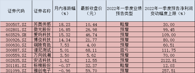 不過,上述52只預喜股月內整體市場表現(xiàn)較為低迷,共有44只個股呈現(xiàn)不同程度的回調,占比84.62%。其中,和勝股份、翔豐華、容百科技、石大勝華、銘利達等5只個股期間累計跌逾15%。與之形成鮮明對比的是,蘇奧傳感、微光股份、愛瑪科技、博俊科技等4只個股較為強勢,期間累計漲逾14%。