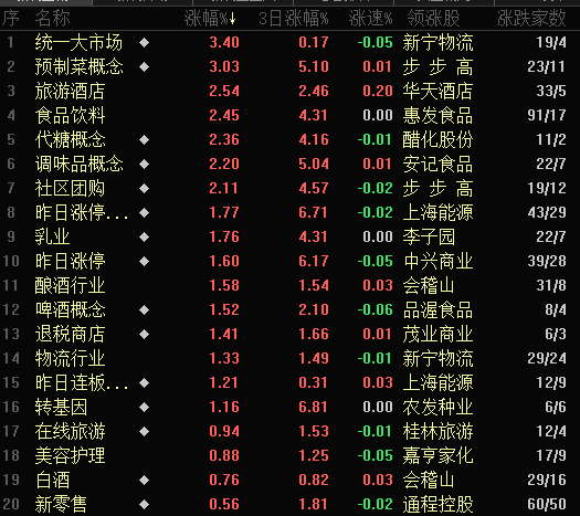 熱點方面,周三,統(tǒng)一大市場、預(yù)制菜概念、代糖概念、調(diào)味品概念、社區(qū)團購等概念板塊強勢上漲,漲幅均超2%;行業(yè)則以旅游酒店和食品飲料領(lǐng)漲。煤炭、貴金屬和鋼鐵行業(yè)居前,跌幅均在4%以上。