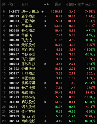 4月20日,統(tǒng)一大市場概念表現(xiàn)出色,截至收盤,板塊漲幅達3.40%。個股中,新寧物流、廣匯物流、三羊馬等3只概念股集體漲停。