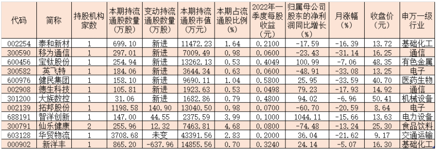 與2021年四季度末持倉相比,養(yǎng)老金新進(jìn)持有7只個股,今年一季度養(yǎng)老金新進(jìn)泰和新材699.10萬股排名第一,移為通信、寶鈦股份、英飛特、健民集團(tuán)、德生科技等5只個股在此期間養(yǎng)老金新進(jìn)數(shù)量也均在百萬股以上,分別為297.01萬股、254.94萬股、184.06萬股、158.10萬股和105.81萬股,大族數(shù)控本期也獲養(yǎng)老金青睞,新進(jìn)數(shù)量為31.06萬股。另外,截至今年一季度末,養(yǎng)老金繼續(xù)對拓邦股份、智洋創(chuàng)新、仙樂健康等3只個股進(jìn)行加倉操作。