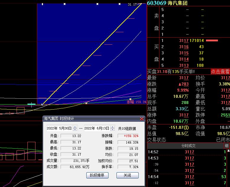 6月13日,熱門股海汽集團(tuán)再度漲停,截至收盤,報31.17元,總市值達(dá)98.5億元,走出了10連板,期間累計漲達(dá)159.32%。