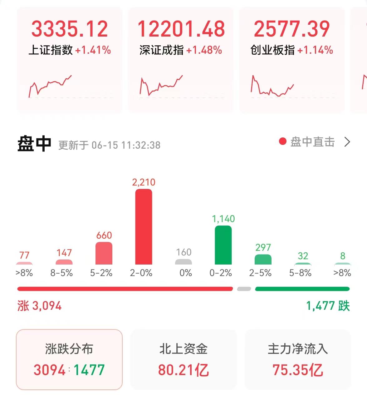 6月15日,三大股指震蕩攀升,全線飄紅。截至上午收盤,上證指數(shù)漲幅達(dá)1.41%,報3335.12點;深證成指和創(chuàng)業(yè)板指漲幅分別為1.48%和1.14%;滬深兩市合計成交額7772.5億元;總體來看,兩市個股漲多跌少。