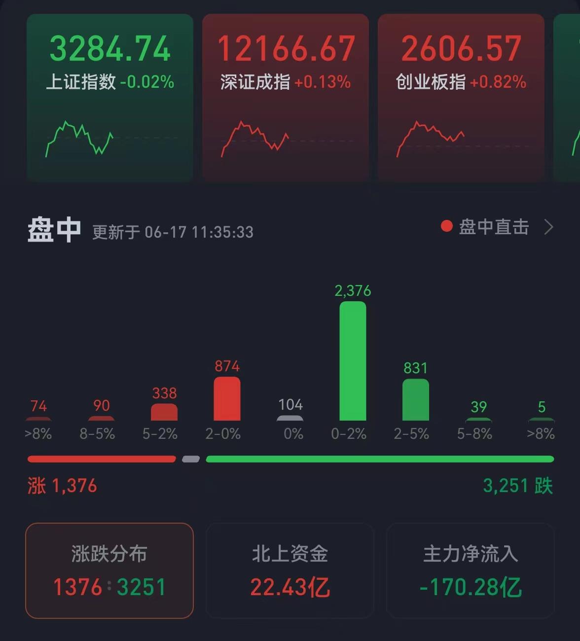 周四(6月16日)美股大幅收跌,道指跌2.42%,下破30000點(diǎn)關(guān)口,納指重挫4.08%,標(biāo)普跌3.25%。6月17日,A股市場繼續(xù)走出獨(dú)立行情。三大股指震蕩分化。截至上午收盤,上證指數(shù)微跌0.02%,報(bào)3284.74點(diǎn);深證成指和創(chuàng)業(yè)板指漲幅分別為0.13%和0.82%;滬深兩市合計(jì)成交額6572.8億元;總體來看,兩市個股跌多漲少。