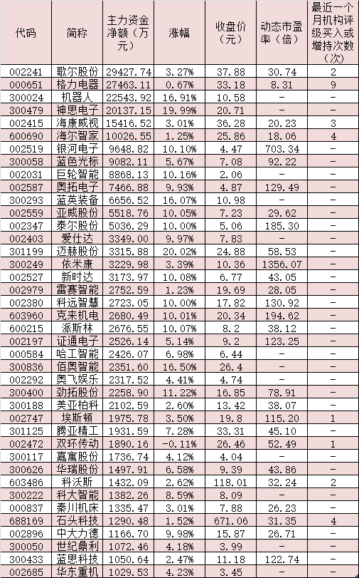 表:6月21日受到超千萬元主力資金追捧的機器人概念股