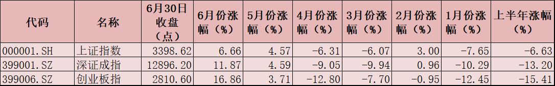 值得一提的是,6月份為A股上半年表現(xiàn)“最優(yōu)秀月”,三大指數(shù)月漲幅均為上半年中最高。其中,上證指數(shù)期間累計上漲6.66%,深證成指期間累計上漲11.87%,創(chuàng)業(yè)板指期間累計上漲16.86%。