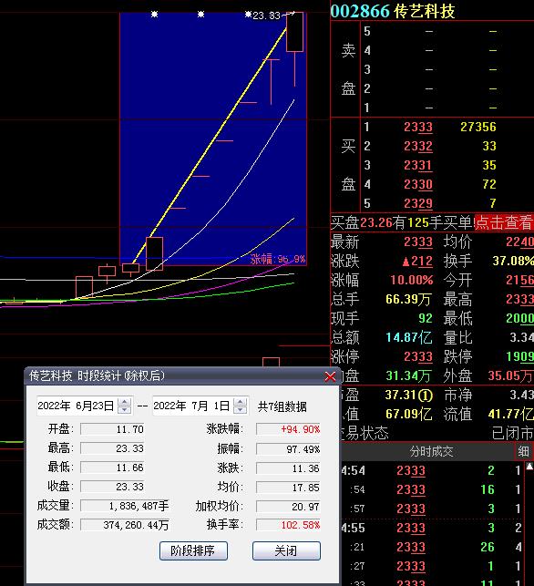 7月1日,熱門股傳藝科技再度漲停,截至收盤,報(bào)23.33元,連續(xù)7個(gè)交易日漲停,期間累計(jì)漲達(dá)94.9%。