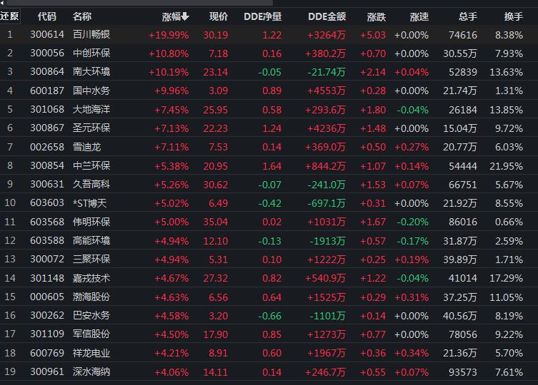 7月1日,環(huán)保行業(yè)漲幅居前達(dá)2%。其中,百川暢銀、國(guó)中水務(wù)、*ST博天等3只概念股集體漲停。