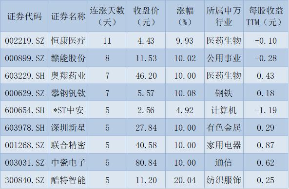 表:連續(xù)上漲5天且今日收盤(pán)漲停股一覽