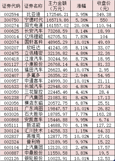 與此同時,市場主力資金積極涌入板塊布局。7月7日,新能源汽車板塊整體呈現(xiàn)主力資金凈流入態(tài)勢,合計吸金119.5億元。其中,27只概念股主力資金凈流入超過1億元,比亞迪、寧德時代、陽光電源等3只概念股最受追捧,主力資金凈流入分別達到17.25億元、16.57億元和16.16億元,長安汽車、億緯鋰能、國軒高科、欣旺達等4只概念股主力資金凈流入也均超4億元。
