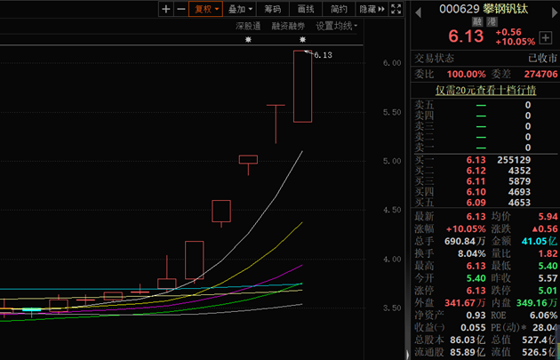 7月7日,攀鋼釩鈦再度漲停,報(bào)6.13元,自6月28日以來,截至7月7日已連續(xù)8個(gè)交易日上漲,累計(jì)漲幅達(dá)70.75%,最近5個(gè)交易日連續(xù)收獲漲停板。