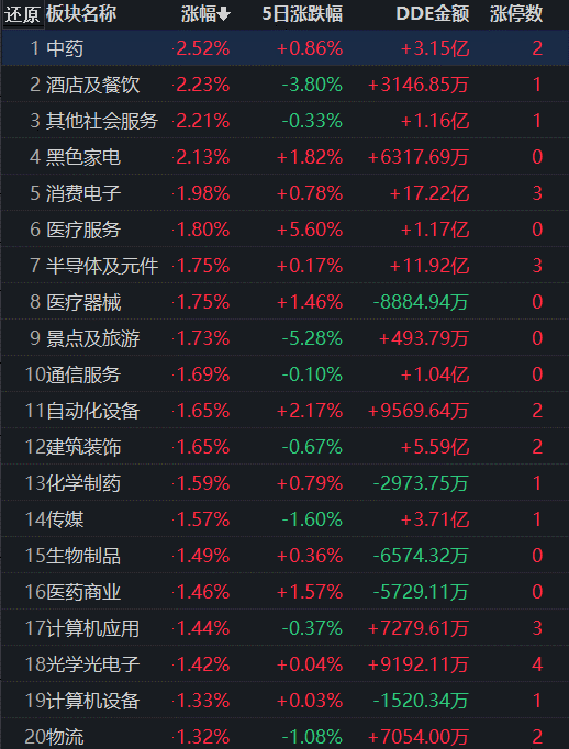 同花順行業(yè)方面,截至7月8日11:30,76類行業(yè)中有60類上漲,占比78.95%。中藥行業(yè)居漲幅榜首,漲幅達(dá)2.52%,此外,酒店及餐飲、其他社會(huì)服務(wù)和黑色家電等行業(yè)漲幅也均超2%;跌幅居首的行業(yè)是金屬新材料,下跌1.51%。