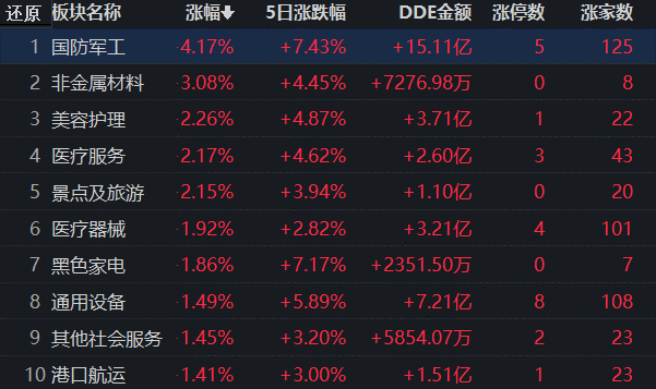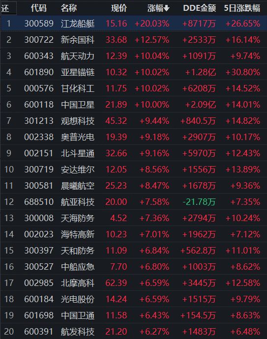 從漲幅居首的國防軍工行業(yè)看,截至7月20日11:30,行業(yè)交易中的126只個股,有125只上漲,其中,有5只個股漲停,有35只個股漲幅超5%。從資金流向看,國防軍工行業(yè)今天上午大單資金凈流入額達15.11億元,居各行業(yè)第1位。