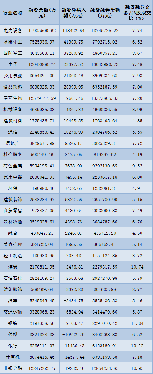表:7月19日申萬一級行業(yè)兩融交易情況: