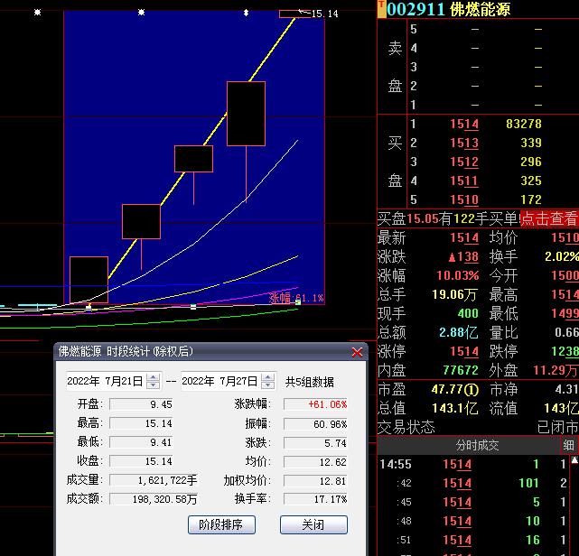 7月27日,燃?xì)恺堫^股佛燃能源再度漲停,截至收盤,報(bào)15.14元,連續(xù)5個交易日漲停,期間累計(jì)漲達(dá)61.06%。