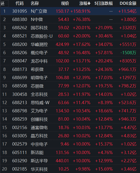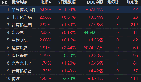 從漲幅居首的半導(dǎo)體及元件行業(yè)看,截至8月5日11:30,行業(yè)交易中的153只個股有142只上漲,其中,有9只個股漲停。從資金流向看,半導(dǎo)體及元件行業(yè)今天上午大單資金凈流入額達(dá)67.84億元,居行業(yè)第1位。
