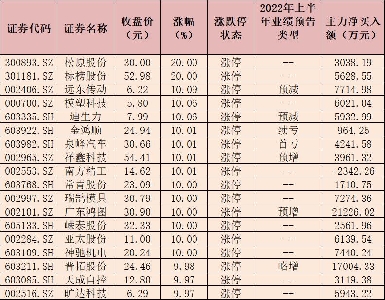 表:8月8日汽車零部件板塊內(nèi)漲停股一覽