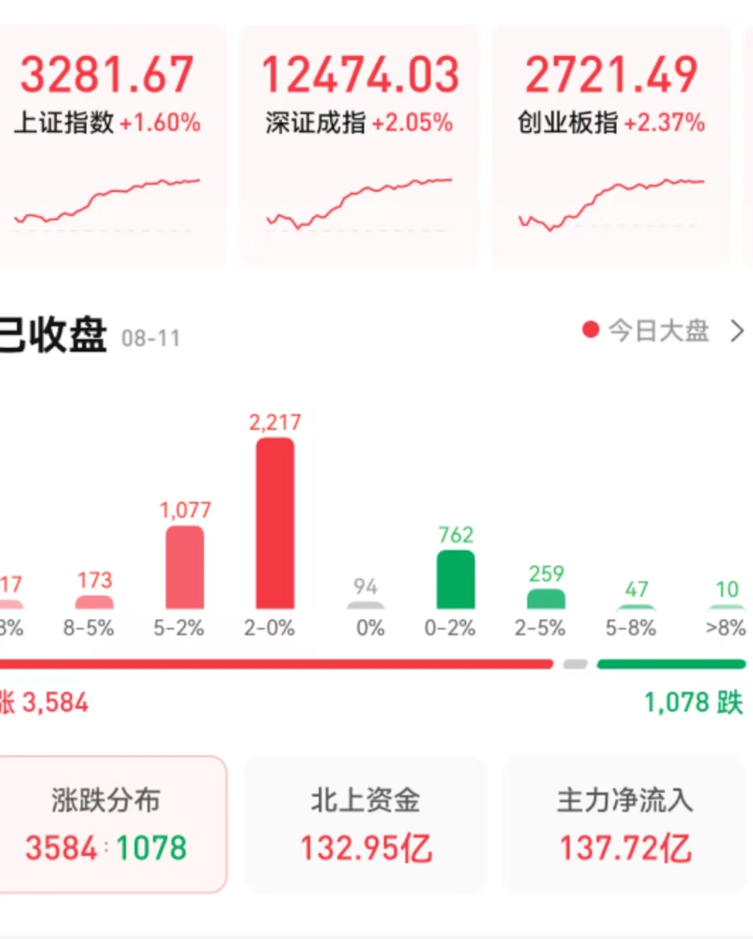 8月11日,三大股指全線飄紅,截至收盤,上證指數(shù)漲幅達(dá)漲1.6%報(bào)3281.67點(diǎn),深證成指漲幅達(dá)2.05%報(bào)12474.03點(diǎn),創(chuàng)業(yè)板指漲幅達(dá)2.37%報(bào)2721.49點(diǎn);兩市合計(jì)成交10667億元??傮w來看,A股個(gè)股漲多跌少。